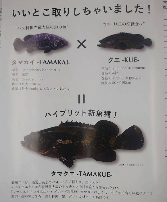 “魚の王様”と言われる高級魚「クエ」とハタ科世界最大級「タマカイ」をかけ合わせた新魚種。
